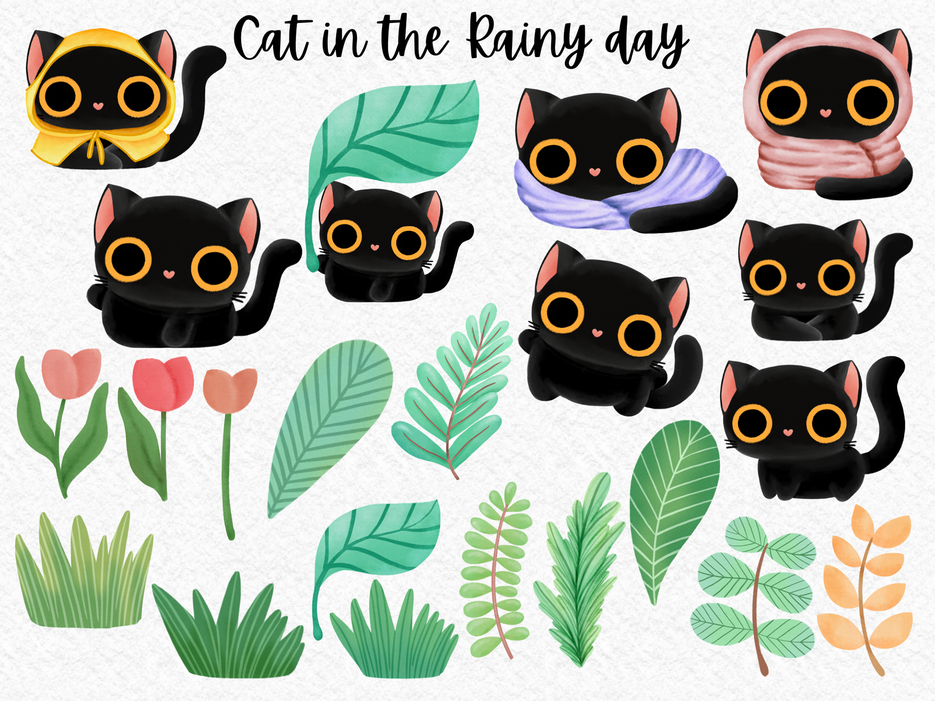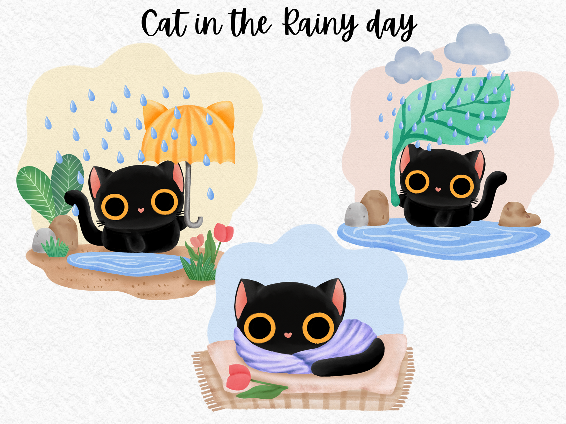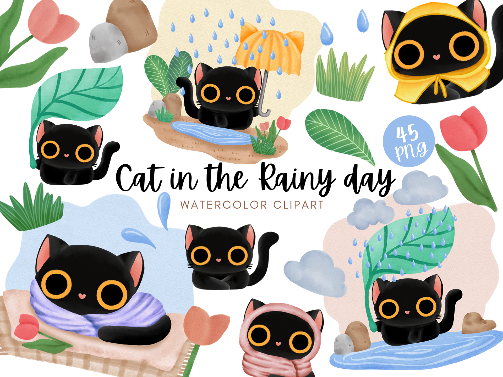 Cat in the Rainy day watercolor clipart PNG cute black cat rain weather cold take care character season change card warm ing house digital download