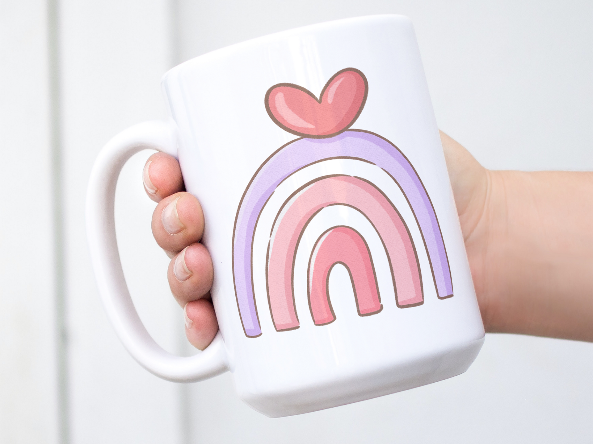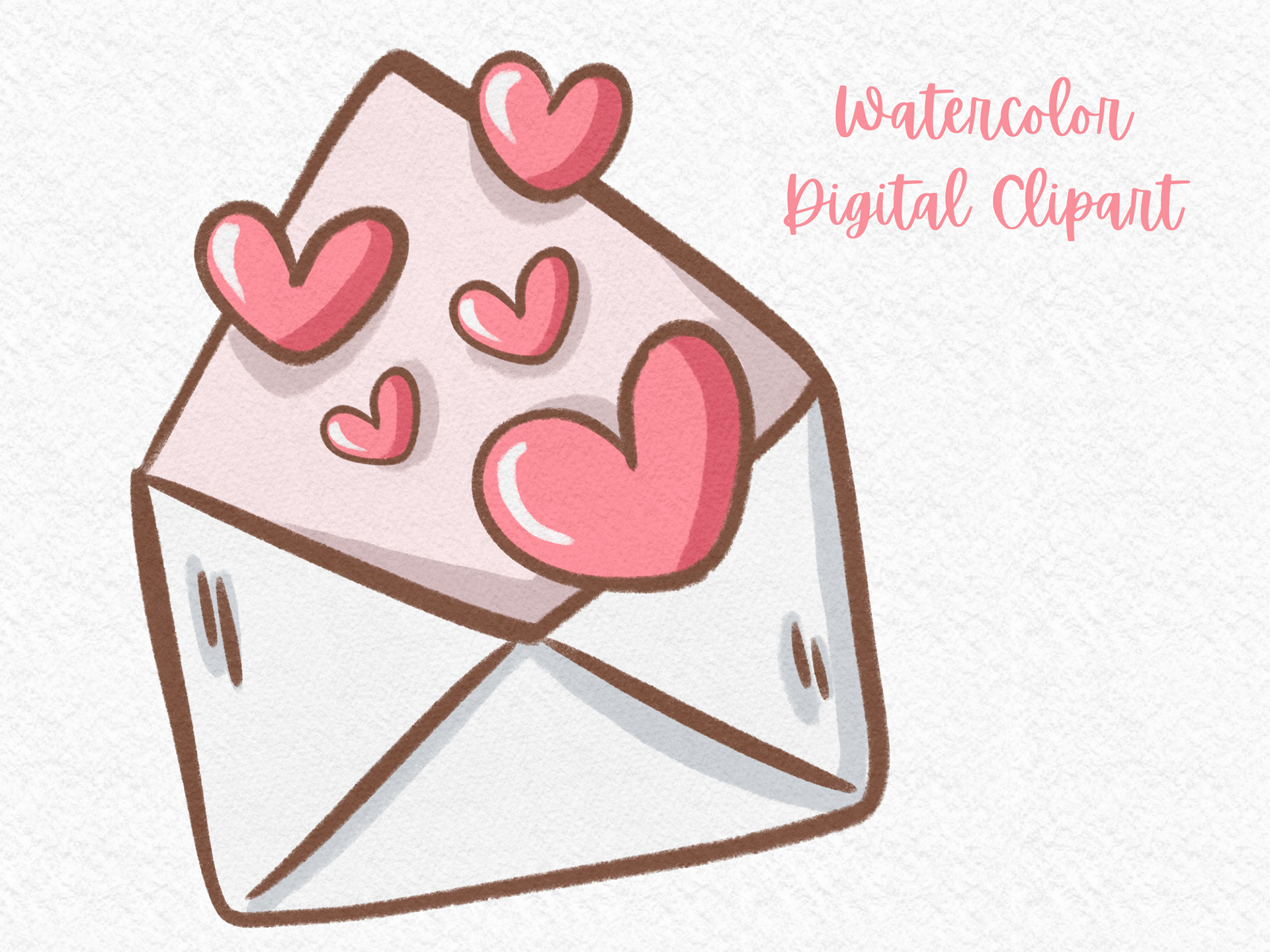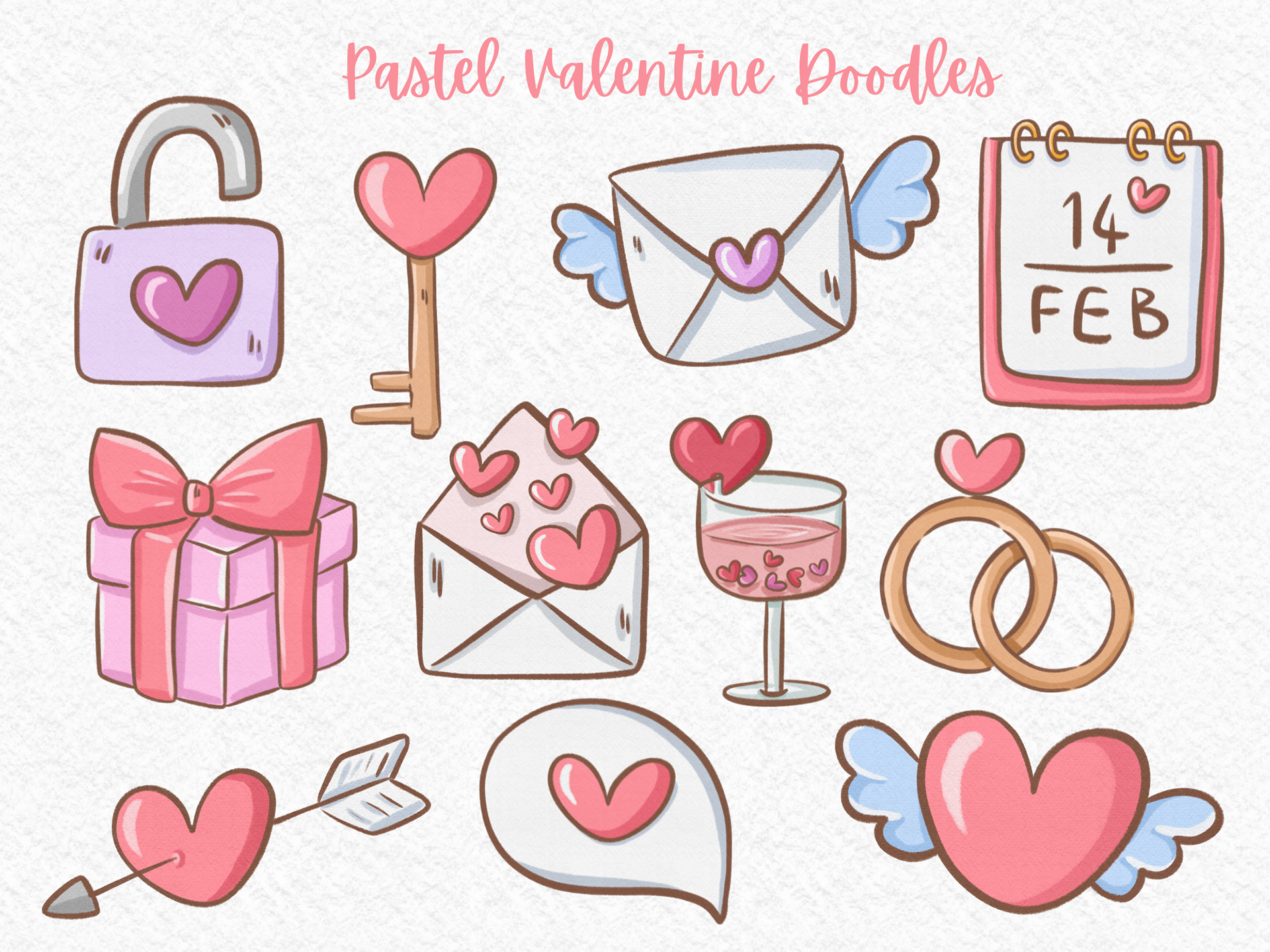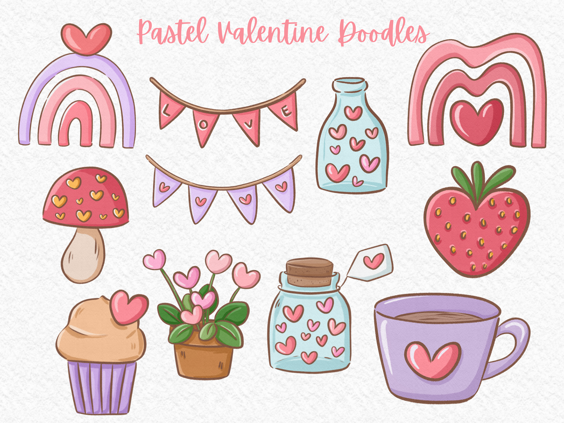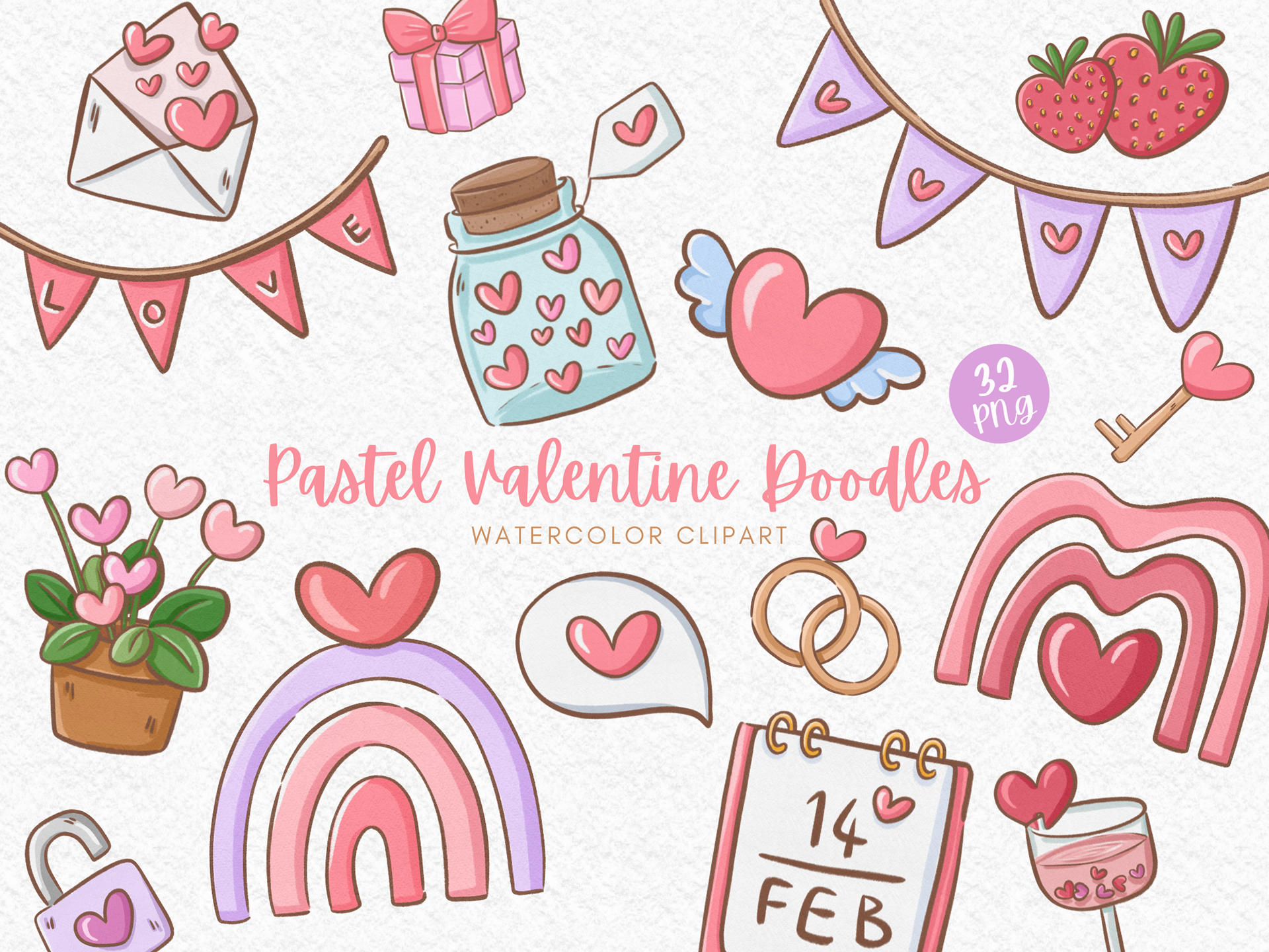 Pastel Valentine Doodle watercolor digital clipart, valentines day, elements cute kawaii pastel colorful sweet rainbow, sublimation card